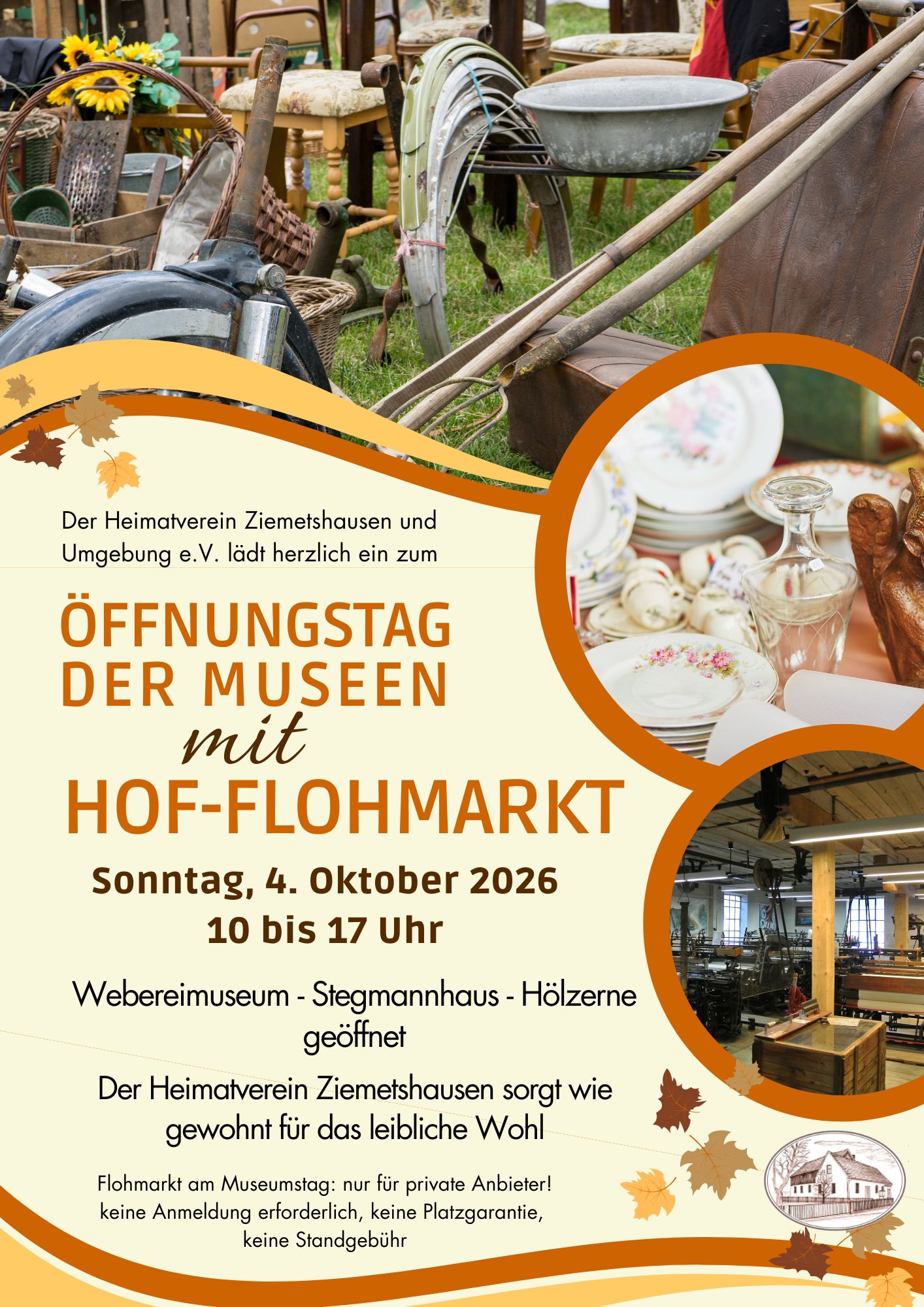 Wer selbst Flohmarktartikel verkaufen möchte, darf seinen Stand im Museumshof aufbauen und seine privaten Waren anbieten. Bitte hierfür selbst Tische etc. mitbringen. Eine Anmeldung ist nicht erforderlich, auch eine Standgebühr wird nicht erhoben, der Heimatverein freut sich stattdessen über eine Spende.